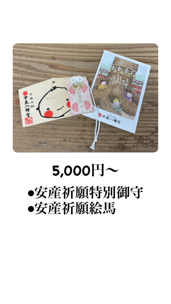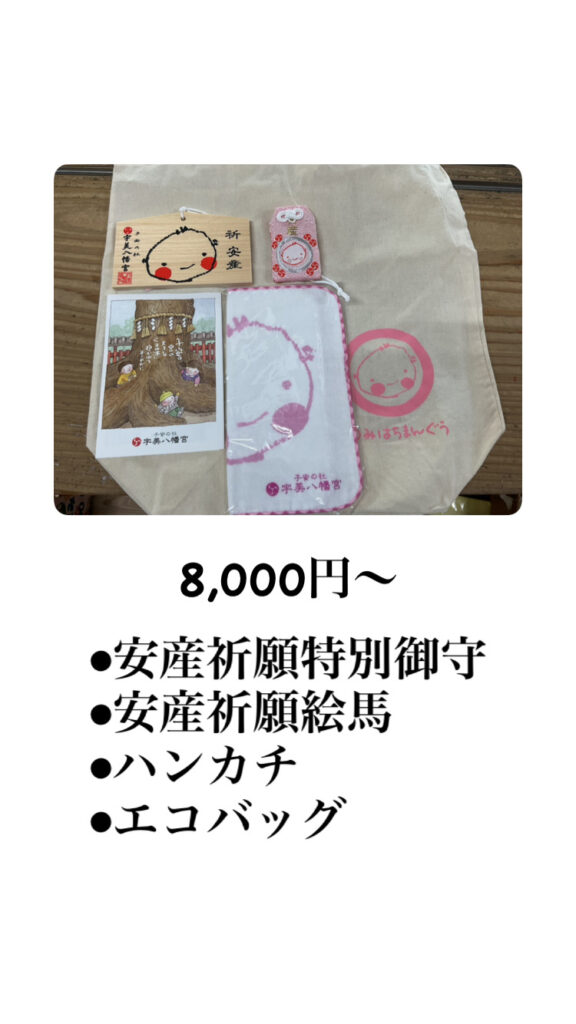 当宮では、昔ながらの晒(さらし)腹帯、ガードル式の補助帯、ワンタッチ式の補助帯と、用途に合わせて三種類をご準備致しております。更に晒腹帯には、当宮キャラクターの刺繍入りもあり、いずれの腹帯もご神前にてお祓いの後、御朱印(宇美八幡宮のおしるし)を押印しています。
